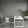Modern desk in powder coated frame finish. The frame sets a strong visual accent and ensures particularly high stability. Soft close rectangular cable grommet in brushed aluminum finish on tabletop for professional and smart working environment.